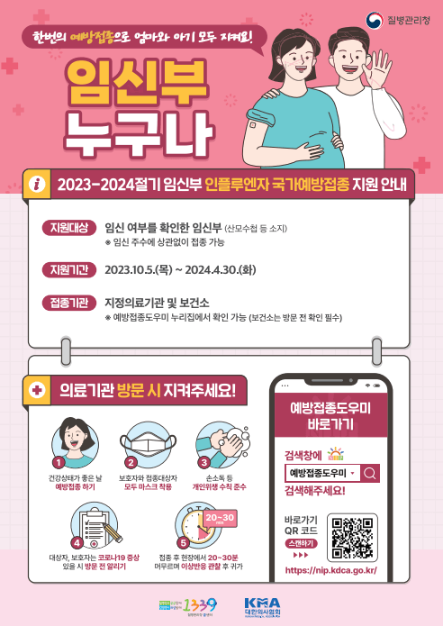 지원기간은 2023.10.5.~2024.4.30.까지 무료 접종기간이며 지정의료기관 및 전국 보건소에서 접종할 수 있습니다.