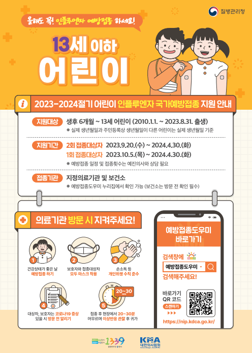 생후 6개월~13세 어린이는 지정의료기관 및 보건소를 이용하시면 주소지에 관계없이 전국 어디서나 무료로 독감예방접종을 받을 수 있습니다.