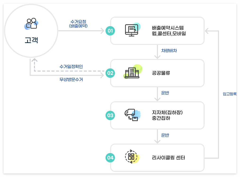 온라인으로 배출예약을 하면 수거일정확인을 통해 해당 장소로 무상방문수거를 합니다.