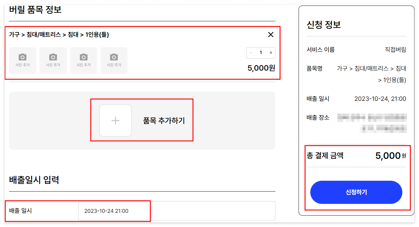 버릴 품목 정보를 선택하고 사진 추가도 가능하며 품목을 추가할 수도 있습니다.