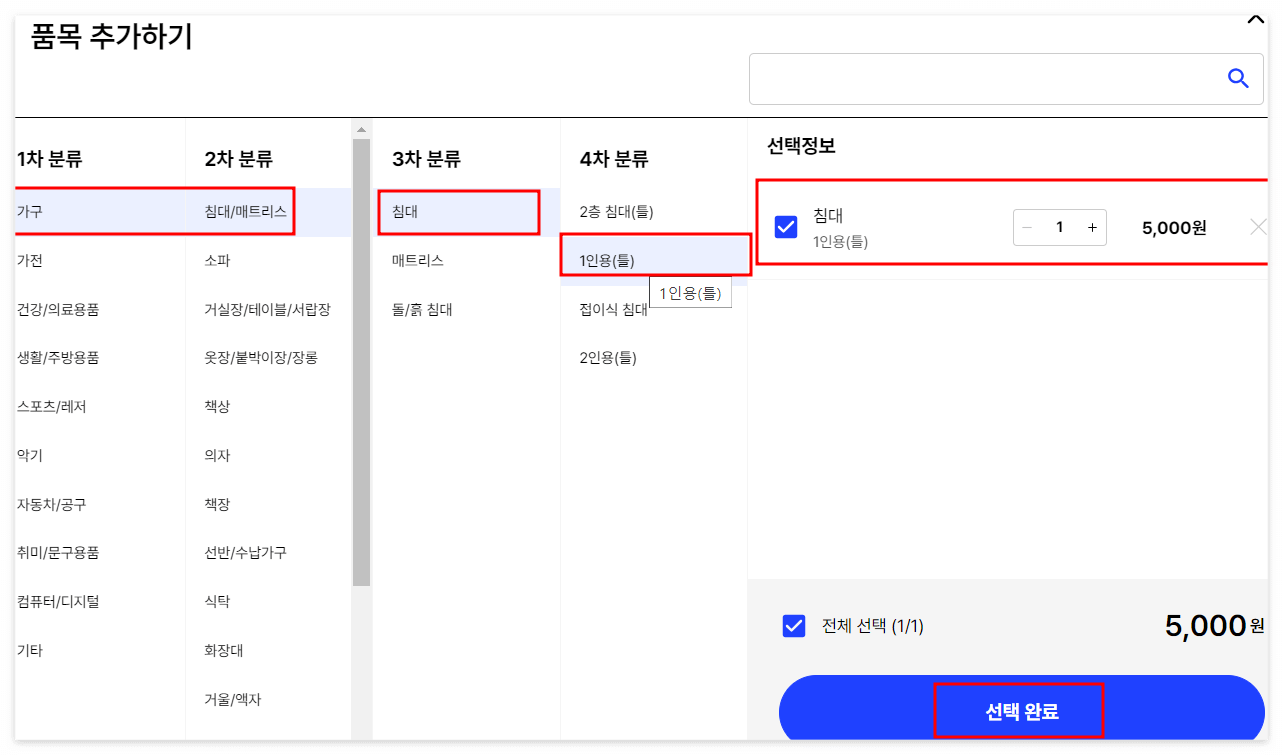 배출하여 버릴 품목을 1차부터 4차까지 분류하여 선택하면 아래와 같이 품목의 비용이 산출됩니다.