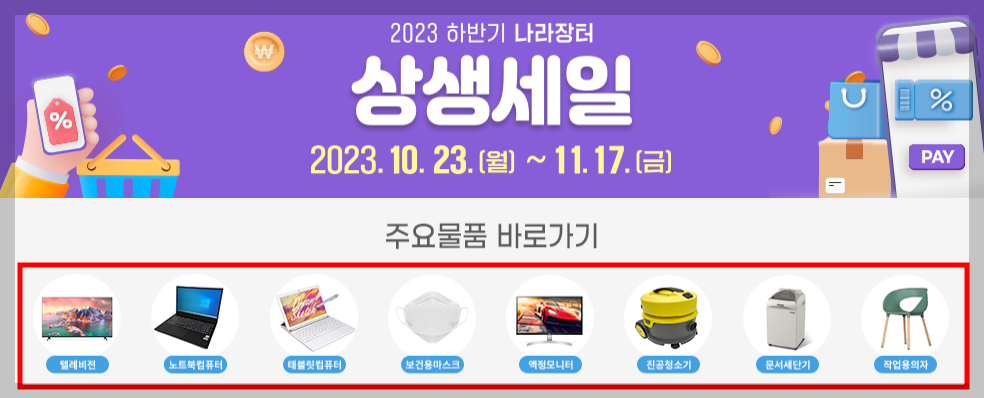 나라장터종합쇼핑몰에서는 2023년 일반국민을 대상으로 상생세일을 실시한다고 합니다.