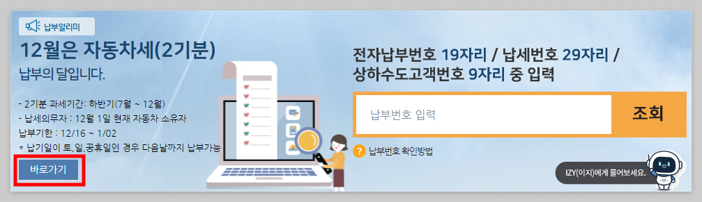 2기분 납부기한은 12월 16일부터 31일까지 이니 자동차세 조회 후 기한 내 납부하시기 바랍니다.