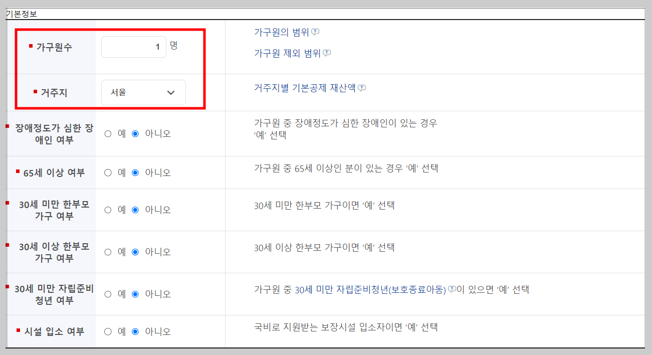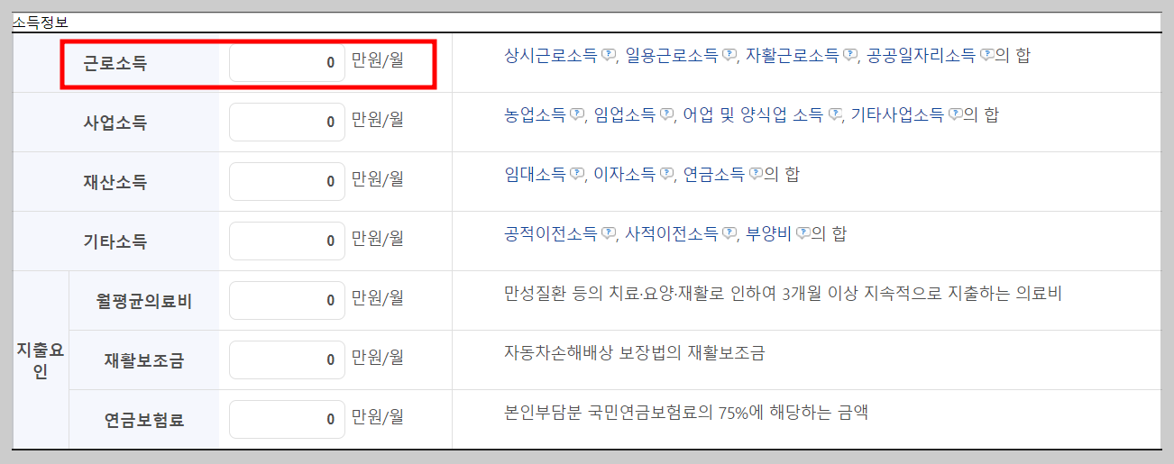 대략적인 정보를 입력하여 모의계산을 통해 기초생활수급 및 의료 급여 소득 인정액 조회가 가능합니다.