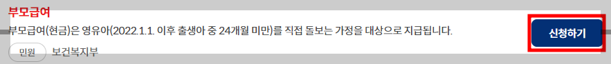 0세(0~11개월)인 아동의 가정, 1세(12~23개월)의 아동을 양육하고 있다면 부모급여 신청이 가능합니다.
