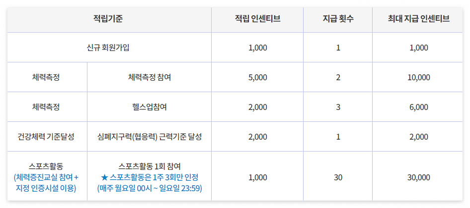 또한, 스포츠활동으로 체력증진교실에 참여하여 지정 인증시설을 이용하면 최대 30,000p의 인센티브를 받을 수 있습니다.