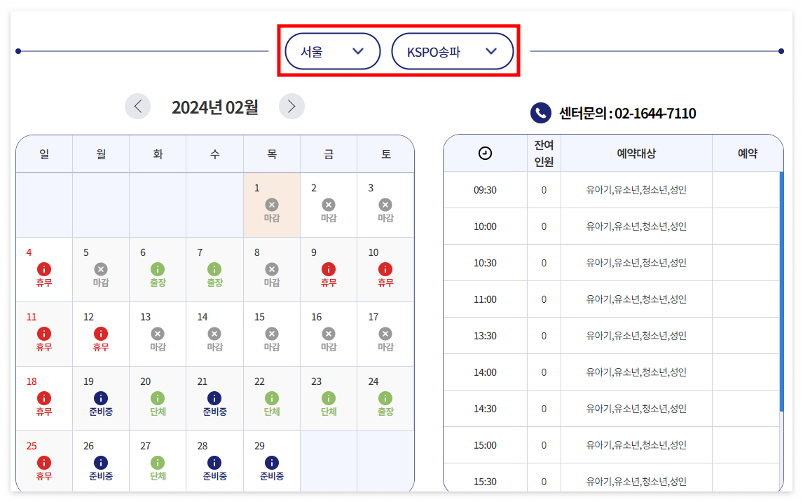 체력측정은 신청자의 지역을 선택하여 잔여인원을 확인하여 예약신청을 할 수 있습니다.