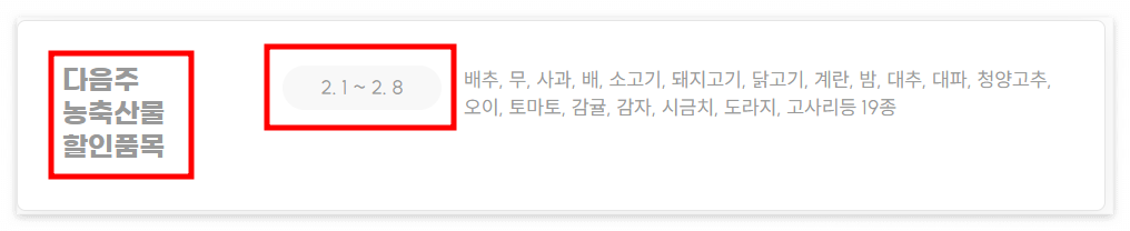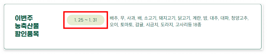 1월 25일부터 31일까지는 배추, 무, 사과, 소고기, 닭고기, 계란 등 18종의 농축산물 할인 판매 품목을 확인하시기 바랍니다.