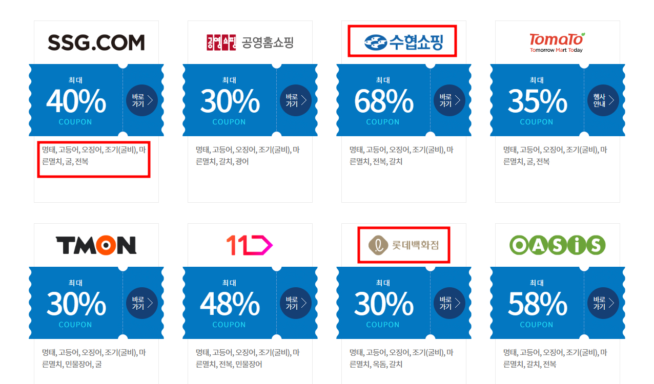 대중적으로 이용하고 있는 여러 홈쇼핑, 온라인 마트 등에서 할인 쿠폰을 다운로드하여 저렴하게 수산물 구매가 가능합니다.
