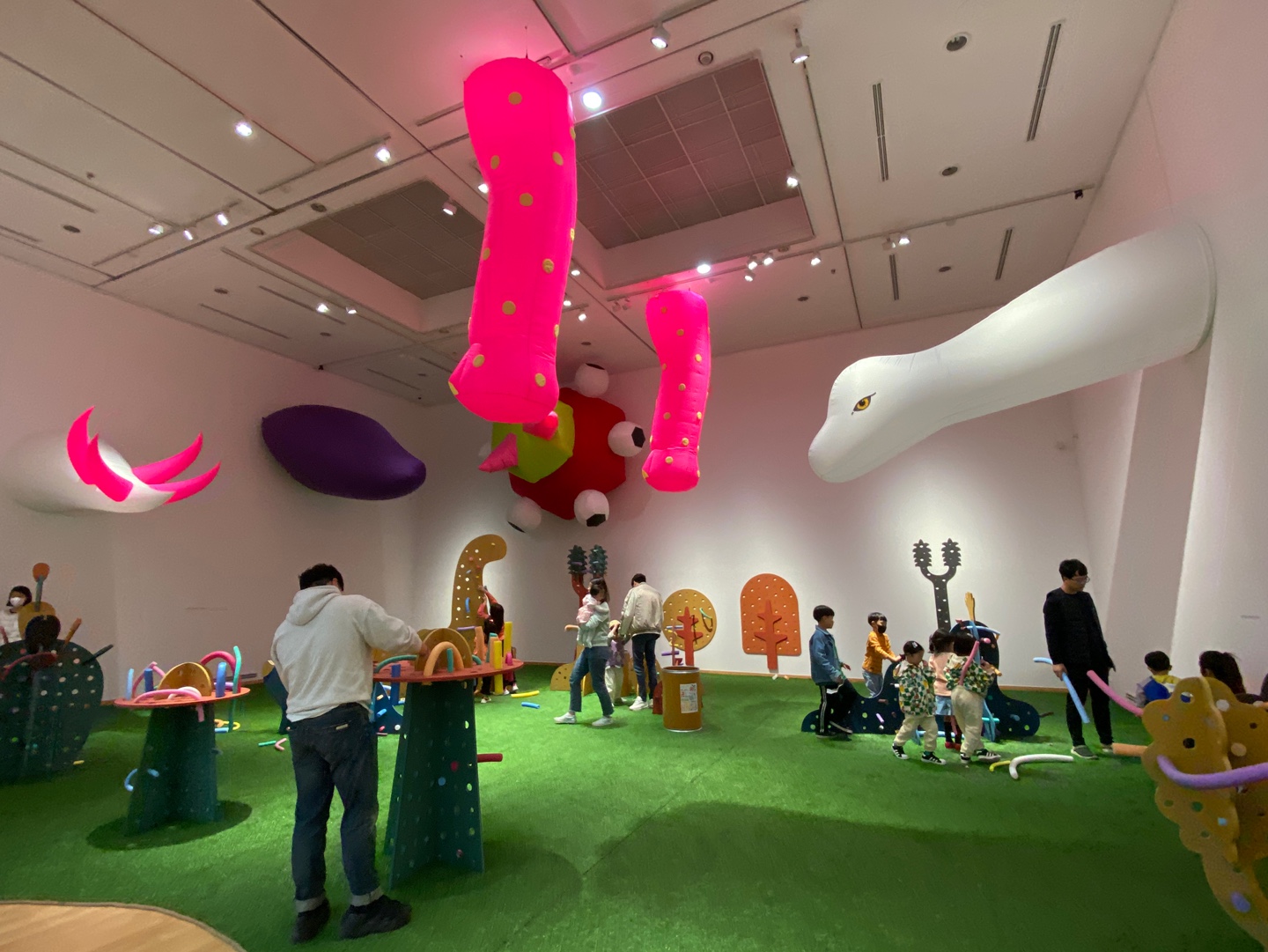 이 전시는 인류 문화의 가장 오래된 형태인 놀이에 관한 전시입니다. 현대미술의 다양성을 어린이들이 즐겁게 체험하면서 자연스럽게 미술과 어우러지는 계기를 마련하고자 기획된 전시라고 합니다. 팬데믹 이후 실내에서 제한적으로 활동하던 어린이들이 마음껏 뛰어놀 수 있는 전시로 예술과 체험이 결합된 전시라 할 수 있습니다.