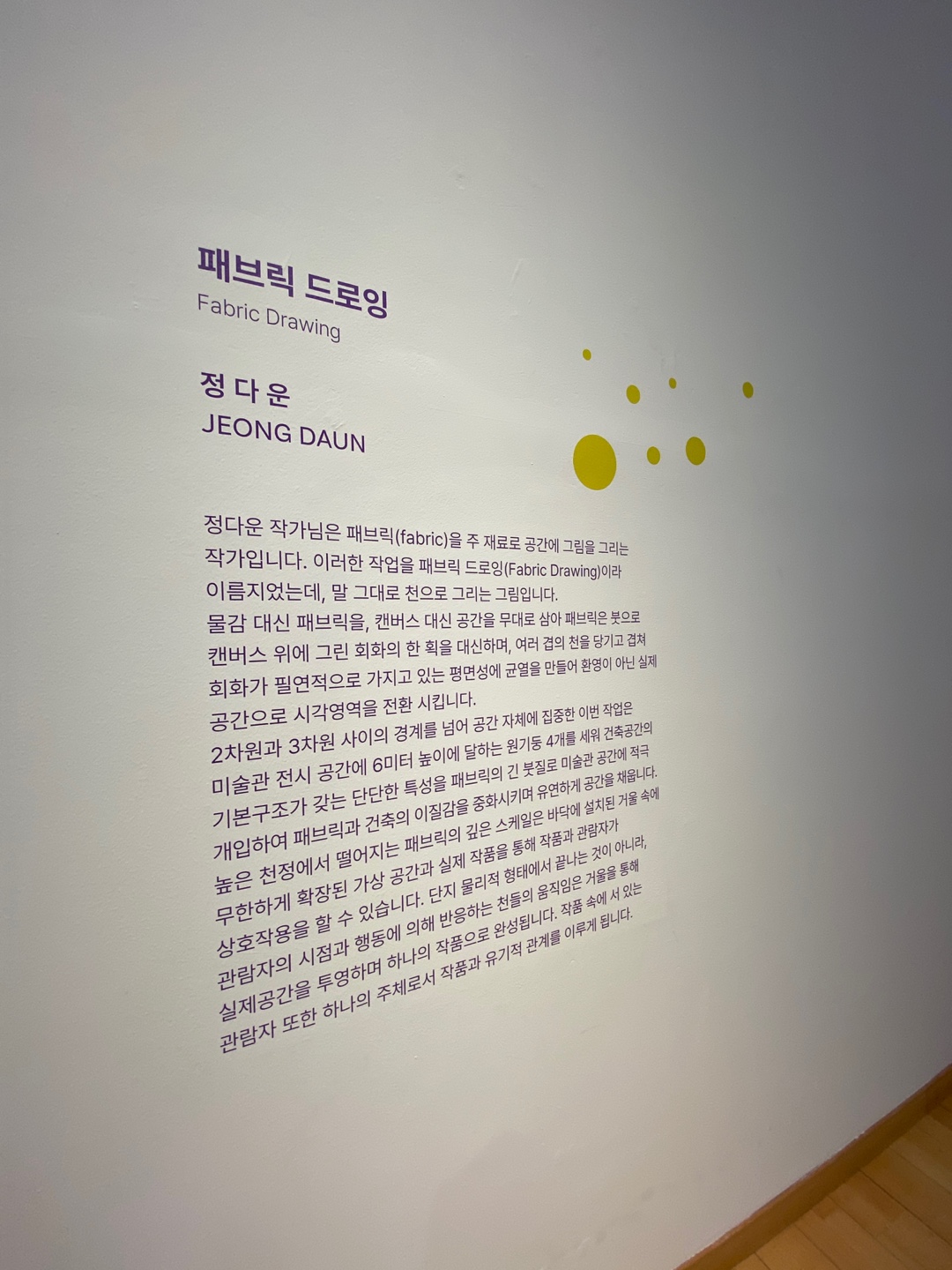패드릭 드로잉은 말 그대로 패브릭을 활용한 예술입니다. 여러가지 느낌의 천으로 전시를 해 놓았고 꼭 펜을 이용한 색칠만이 드로잉이 아니라 물감 대신 여러 소재의 패브릭으로도 그림이 완성될 수 있다는 의미를 가진 전시입니다.