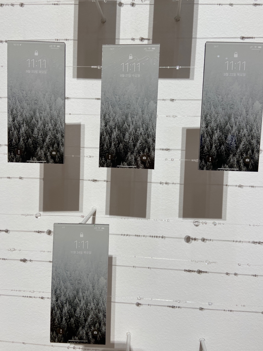 박세연 작가님의 전시는 일상 속의 무한, 그 섬광의 세계라는 주제로 전시라 되어 있습니다. 스마트폰 메인 화면의 여러 시간대로 나타냈습니다.