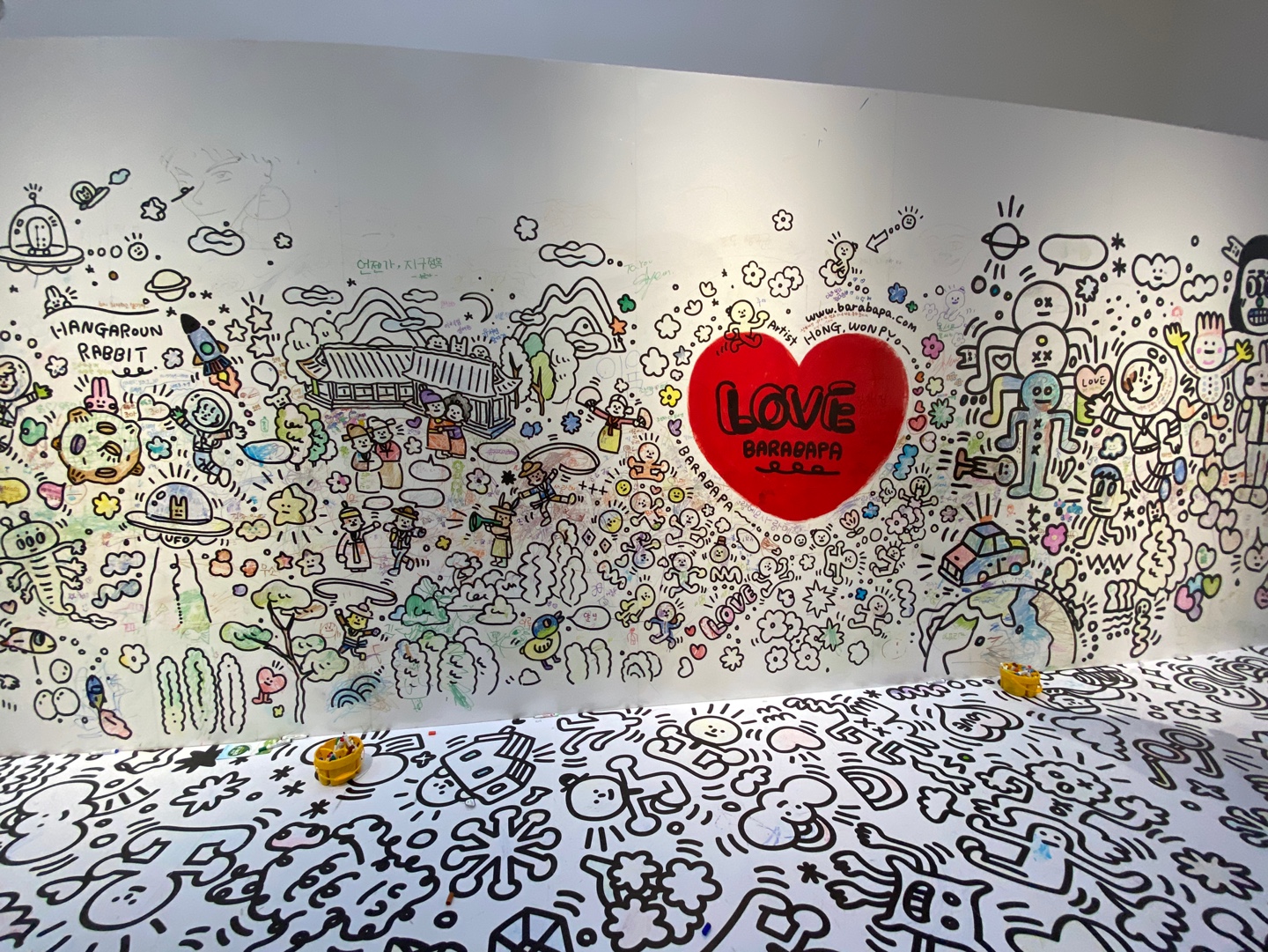 백업 체험에 이어 반대쪽에는 재미난 그림이 벽에 그려져 있습니다. 예술공간의 한편을 거의 다 차지하고 있고 그려진 그림에 아이들이 색칠하고 낙서하며 하나의 작품이 완성되가고 있는 것 같습니다.
