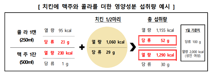 최근 외식배달 서비스가 확대되면서 치킨 시장도 크게 성장하고 있는 추세입니다. 프랜차이즈 치킨 1마리 당 열량이 많게는 1일 섭취기준의 약 1.5배를 차지하기까지 한다고 한다. 치킨 한 마리의 열량은 1,554kcal~3,103kcal로 1일 에너지 필요 추정량 대치 적게는 78%에서 많게는 155%까지 차지한다고 한다. 3대 영양소 함량은 1일 영양성분 기춘치로 45g~282g(14%~87%), 단백질은 128g~175g(233%~318%), 지방은 71g~174g(131%~322%) 수준이라고 한다. 또한 치킨 한 마리에 함유된 포화지방은 13g~49g(180%~303%), 콜레스테롤은 541mg~909mg(64%~241%), 나트륨은 1,272mg~4,828mg(64%~241%), 당류는 5g~201~(5%~201%)이므로, 콜레스테롤과 포화지방, 나트륨이 평균 이상으로 포함되어 있으니 과하게 섭취하지 않고 양을 조절할 필요가 있다. 거기에 치킨고 같이 먹는 맥주와 콜라에도 많은 당류가 포함되어 있어서 더욱 조절이 필요할 것이다.