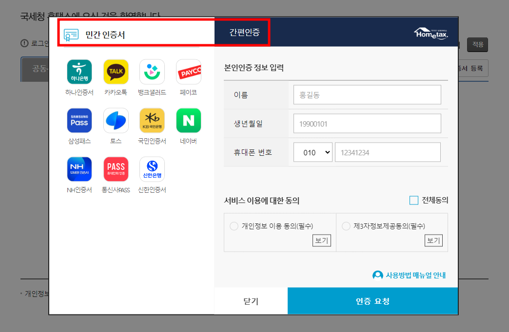 국세청 홈택스에 들어가서 아래와 같이 근로·자녀장려금 신청 바로가기를 클릭하면 인증하라는 화면이 나오는데 민간인증서 중 카카톡으로 간편인증을 하면 편리합니다.