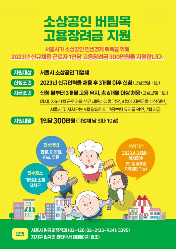 2023년 서울시에서는 소상공인 민생경제 회복을 위하여 소공인 버팀목 고용장려금을 지원한다고 합니다. 코로나19 장기화, 경기침체, 물가상승 등으로 어려움을 겪고 있는 소상공인 및 소기업의 안정을 위해 마련된다고 합니다. 이로써 무급휴직 근로자의 실업을 예방하고 소기업의 경영안정을 도모한다고 합니다. 서울시에서 1인당 300만원(기업체 당 최대 10명까지) 지원을 해주고 있습니다. 오늘 포스팅에서는 소상공인 버팀목 고용장려금에 대해 알아보고 기간 내 신청하시기 바랍니다.