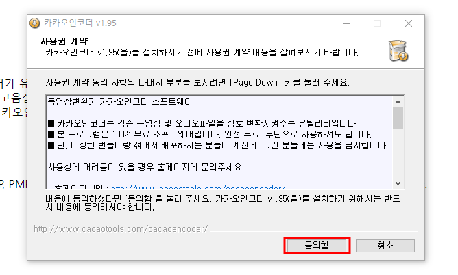 ✔ 위 서버에서 바로 받기를 누르면 카카오인코더 셋업 파일 하나가 다운로드됩니다. 다운로드된 파일을 누르면 설치창이 나오게 됩니다. 사용할 내용에 대한 동의를 누르면 됩니다.