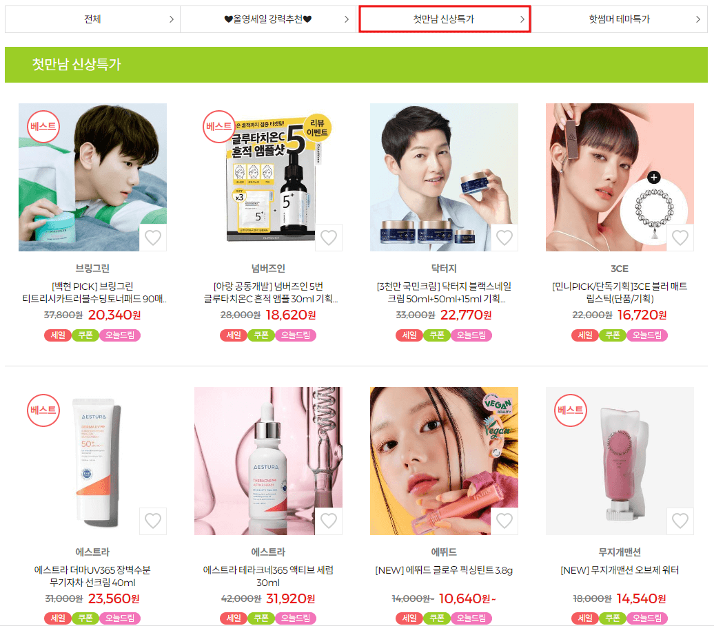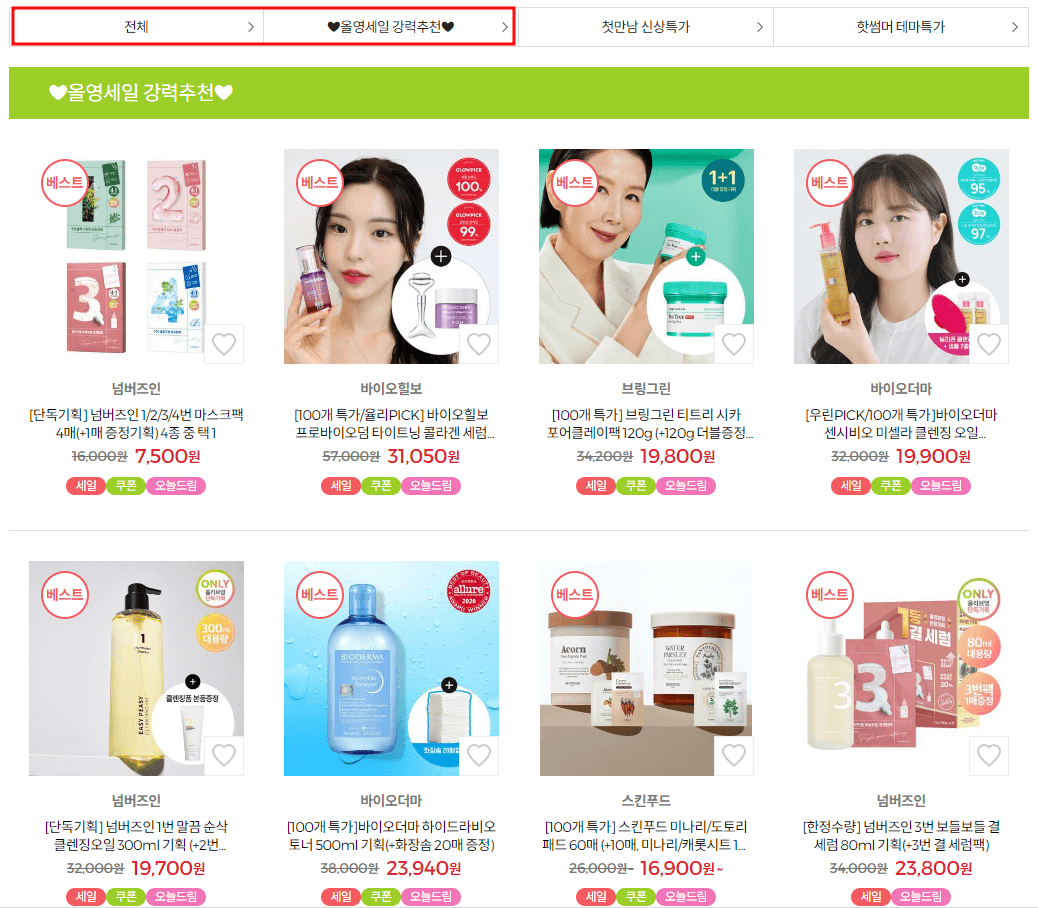 이번 올영세일에 올영의 베스트 브랜드들이 많이 참여하고 있습니다. 백현이 모델로 있는 브링그린, 닥터지, 달바, 키스미, 라보에이치 등 여러 브랜드가 세일에 동참하고 있고 올영세일 강력추천 아이템부터 첫 만남 신상특가, 핫썸머 테마특가까지 여러 종류의 다양한 제품들이 세일을 하고 있습니다. 아래는 강력 추천 아이템들입니다.