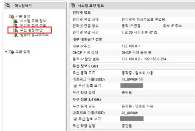 - 왼쪽 상단 메뉴에서 [기본설정-무선설정/보안]에 접속한다.