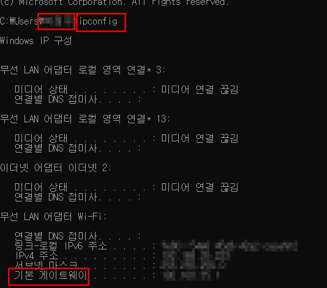 그럼 아래와 같이 검정 화면이 나오는데 상단의 User옆에 이름이 나오고 그 옆에 ipconfig를 입력하고 엔터키를 눌러줍니다. 그럼 아래와 같은 글들이 쭉 나오는데 여기서 기본 게이트웨이 옆 아이피 주소를 확인해 줍니다. 해당 주소가 192.168.0.1이 아니라면 접속 주소의 문제입니다. 그렇다면 기본 게이트웨이 아이피 주소를 주소창에 입력해 주면 공유기 관리자 모드로 접속할 수 있습니다.