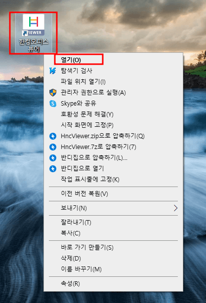 ✔ 그럼 이제 설치가 잘 되었는지, 한글 파일이 잘 열리는지 확인해 보도록 하겠습니다. 바탕화면에 설치된 한컴오피스 뷰어 아이콘에 커서를 대로 마우스 오른쪽 버튼을 눌러주면 아래와 같이 실행 메뉴가 나오는데 열기를 클릭해 줍니다.