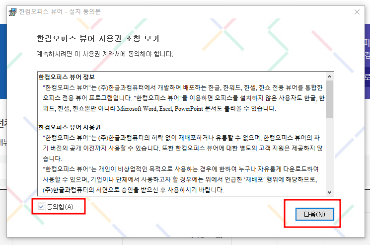✔ 한컴오피스 뷰어 설치 관리자가 시작됩니다. 다음을 누르시고 동의한 후 다시 다음을 눌러주세요.