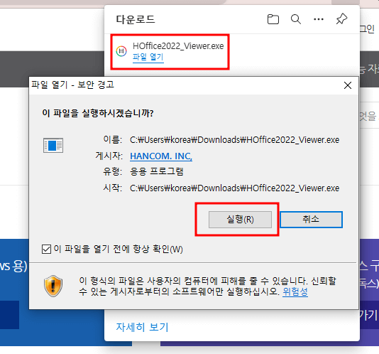 ✔ 그리고 다운로드 된 뷰어 설치 파일 열기를 클릭하면 실행하라는 창이 나오면 실행을 눌러 줍니다.