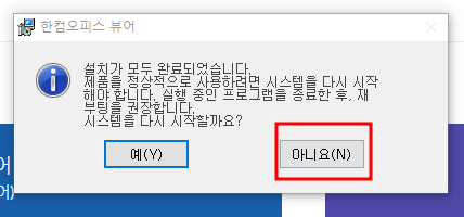 ✔ 설치가 모두 완료되었다는 메세지가메시지가 나오면서 제품을 정상적으로 사용하려면 시스템을 다시 시작하라고 묻는 메시지가 나오는데 예! 하지 않고 아니오! 를 눌러주시기 바랍니다. 아니오 하고 실행해도 전혀 문제가 없습니다.