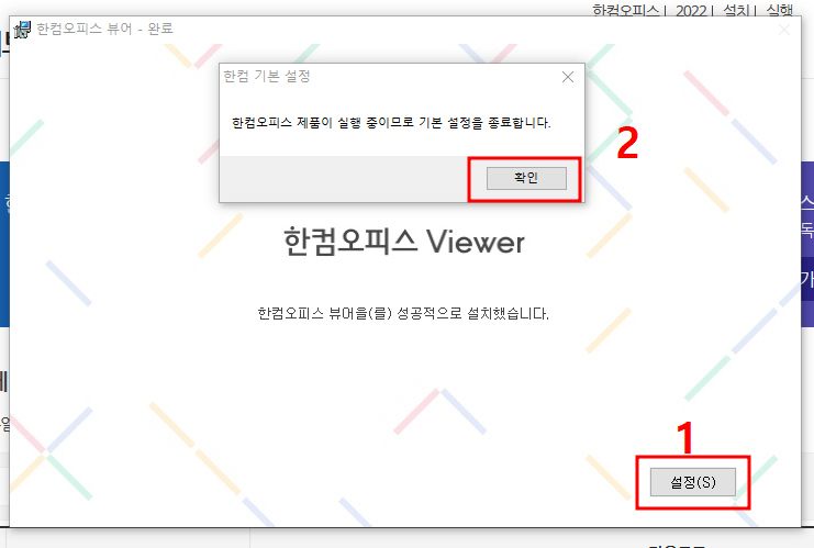 ✔ 한컴오피스 뷰어를 성공적으로 설치했다는 메세지가 나오면 설정을 눌러줍니다. 그럼 기본 설정을 종료하겠다는 창의 확인을 눌러 주면 됩니다.