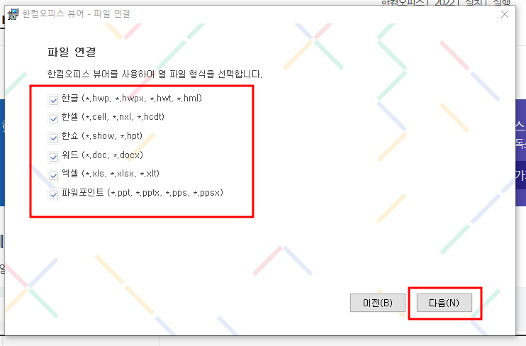 ✔ 설치가 되면 아래와 같이 사용할 파일을 연결하라는 메세지가 나오게 됩니다. 보통 한글 외 문서 작업을 할 경우 두루 사용하는 오피스들이기에 전부 클릭해 두어 설치하였습니다.