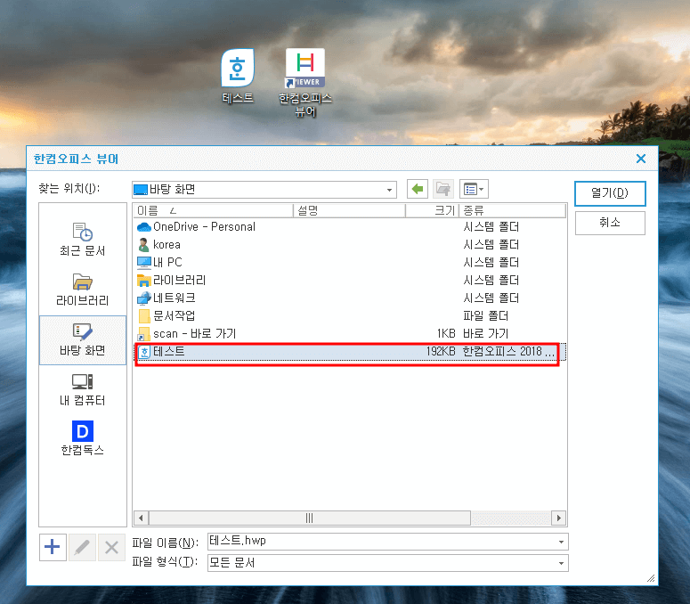 ✔ 열기를 클릭하면 파일을 찾는 창이 열리고 한글 파일 하나를 클릭해서 파일을 열어 줍니다.