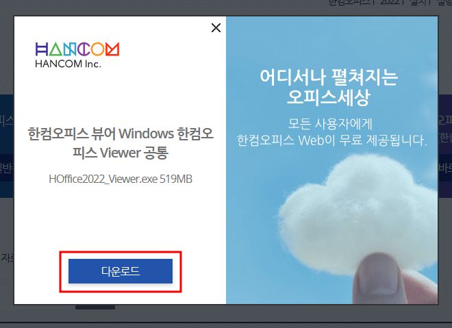 한글 파일을 열어보기 위해서는 한글 프로그램이 있어야 합니다. 그러나 한글 프로그램은 사용자가 직접 구매해야만 사용이 가능합니다. 바로 한컴오피스를 구매하면 여러 종류의 문서 파일을 사용할 수 있지만 프로그램을 구매해서 사용해야 하기에 우리는 통합 뷰어를 다운로드하여 사용하도록 하겠습니다. 한 번 설치하면 사용자가 프로그램을 지우기 전까지 계속해서 사용할 수 있습니다. 한글 통합 뷰어를 다운로드하기 위해서는 한컴오피스 홈페이지에 접속해야 합니다. 아래 다운로드를 클릭하여 한컴오피스 2022 뷰어를 다운로드합니다.
