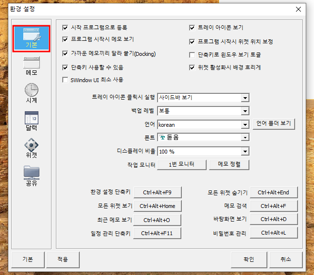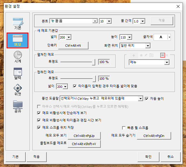 ✔ 메모를 자주 사용하는 분들이라면 기본 탭에서 단축키를 자신에게 맞게 세팅을 할 수 있습니다. 메모 탭에서는 현재 활성화되고 있는 메모에 대한 설정 값을 변경할 수 있는 기능들이 있습니다.