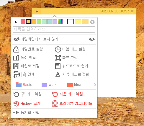 ✔ 이제 에스메모 S메모장의 유용한 팁을 알려드립니다. 아래 파일 박스를 클릭하면 아래와 같이 메모 색상이나 저장 방법, 인쇄, 고정, 나의 메모를 가릴 수 있는 비밀번호까지 설정할 수 있습니다.