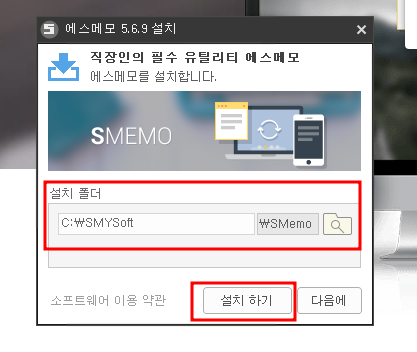 ✔ 에스메모 5.6.9 설치 창이 열리면 설치 폴더를 선택하고 설치하기를 클릭합니다. 폴더 선택은 하지 않아도 무방합니다.