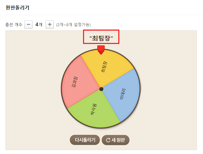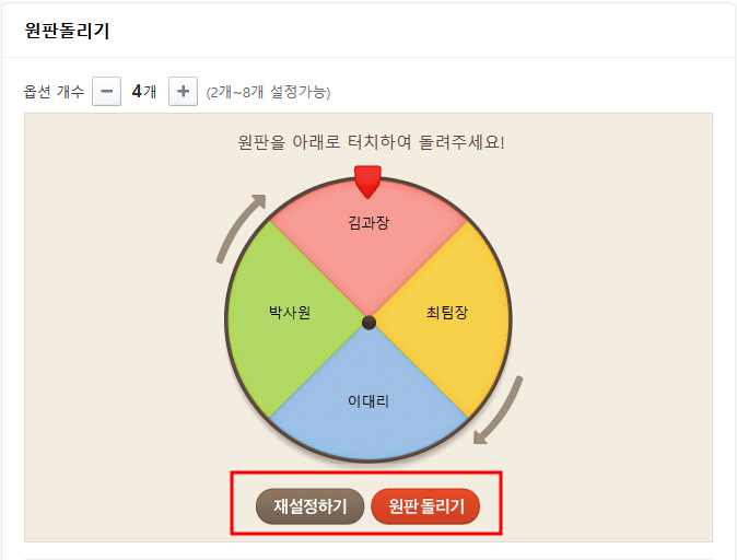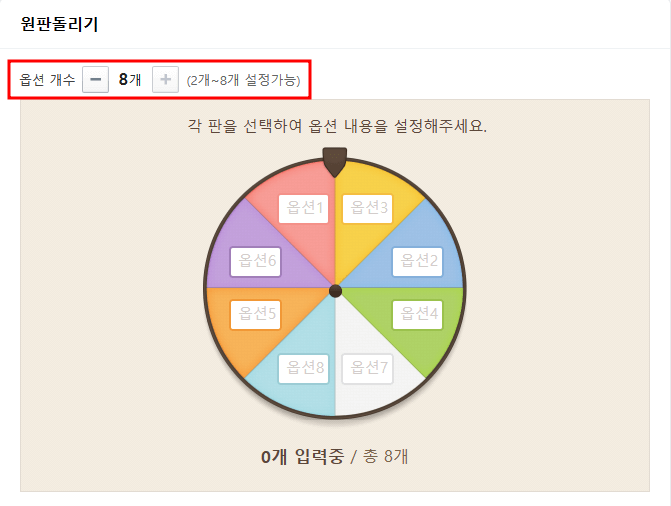 링크를 타고 이동하시면 원판 돌리기 화면이 아래와 같이 나오게 됩니다. 여기서 원판의 옵션을 선택할 수 있는데 옵션 개수를 최소 2개부터 최대 8개까지 선택할 수 있습니다.