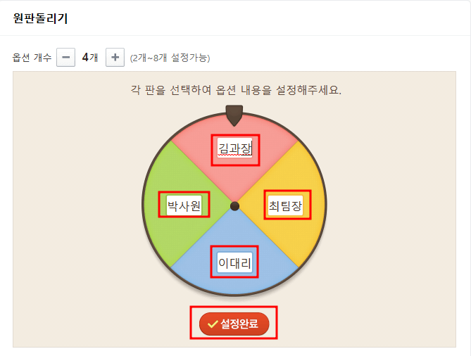 옵션 개수 4개로 하여 원판 돌리기를 설정해 보겠습니다. 원판 안의 옵션 내용을 입력하면 됩니다. 예를 들어 직원이 4명으로 김 과장, 박사원, 최팀장, 이대리 이렇게 4명을 입력하고 설정완료를 눌러줍니다.