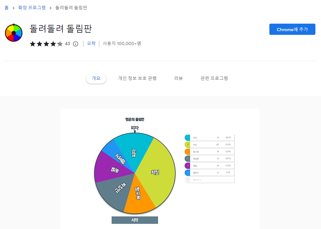 네이버 돌림판은 최대 8개까지만 옵션을 설정할 수 있는데 더 많은 직원으로 옵션을 설정하고 싶다면 크롭 웹스토어에서 제공하는 돌려 돌려 돌림판을 이용하시면 됩니다. 인원수대로 추가할 수가 있어서 좋지만 일일이 입력해야 한다는 단점이 있습니다. 아래 이미지를 클릭하시어 크롬 브라우저에서 설치하여 이용하시기 바랍니다.