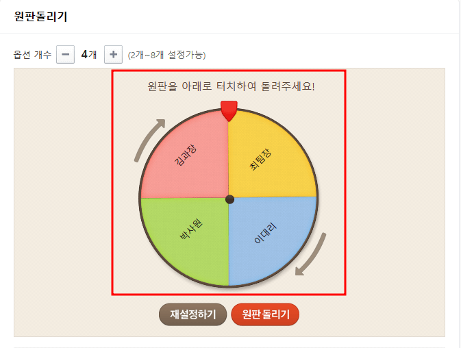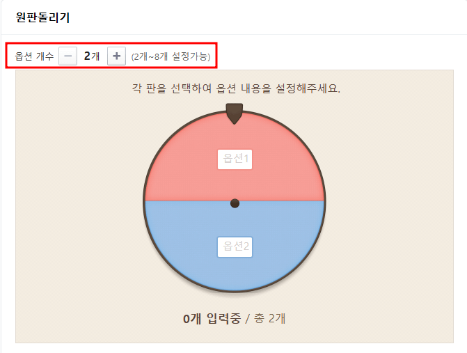 링크를 타고 이동하시면 원판 돌리기 화면이 아래와 같이 나오게 됩니다. 여기서 원판의 옵션을 선택할 수 있는데 옵션 개수를 최소 2개부터 최대 8개까지 선택할 수 있습니다.