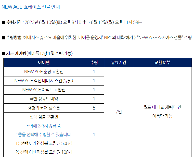 메이플스토리 여름 쇼케이스가 열렸습니다. 'NEW AGE(뉴 에이지)'라는 제목으로 열고 메이플스토리가 앞으로 펼쳐나갈 새로운 시대를 예고했다고 합니다. 이 날 쇼케이스에 방문한 2700여 명의 관객과 전국 14곳 CGV 상영관에 참가한 사람들까지 약 5000명의 사람들이 참석했다고 합니다. 또한 동시 송출을 진행한 유튜브와 트위치 채널에서도 7만 5천 명 정도의 사람들이 실시간으로 참여했다고 합니다.