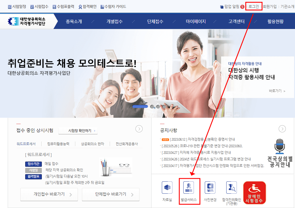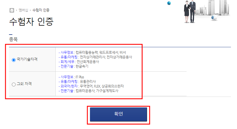 ✔ 홈페이지 메인 화면 아래의 공지사항 밑에 발급 서비스를 클릭하고 수험자 인증을 합니다. 어떤 자격종목을 조회하고 싶은지 선택하고 확인을 눌러 줍니다.