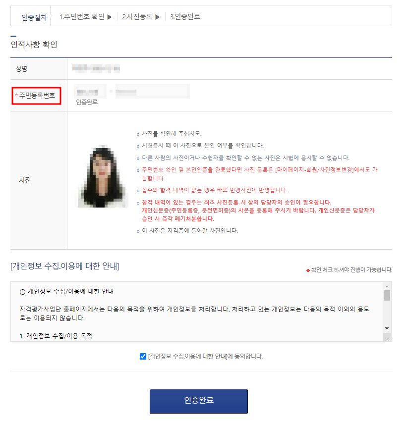 ✔ 수험자 인증을 완료하면 바로 아래 인적사항을 확인하라고 하는데 주민등록번호만 눌러주면 아래와 같이 사진이 자동으로 나오며 개인정보수집 동의에 체크한 후 인증완료를 눌러줍니다.