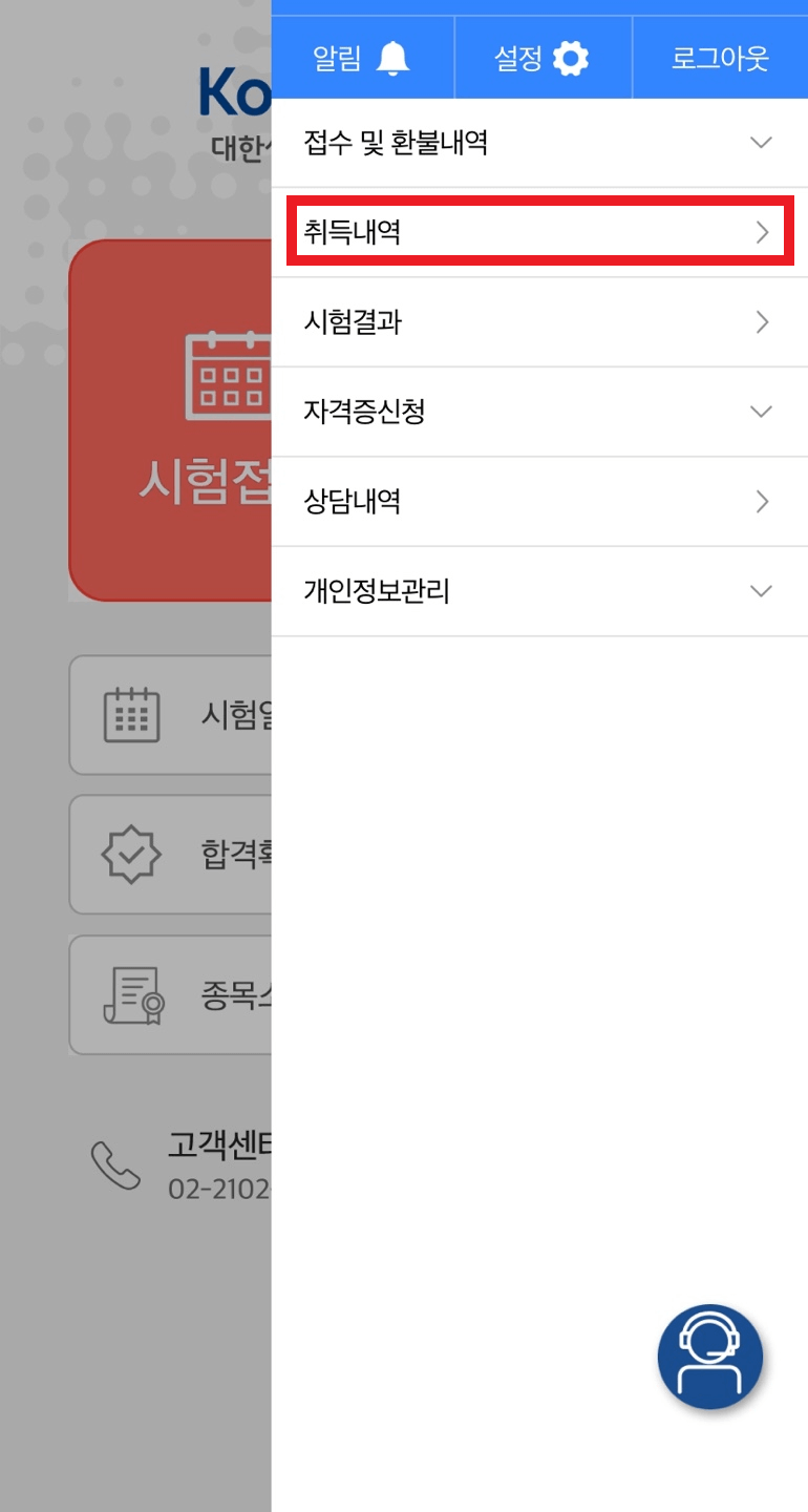 ✔ 모바일앱을 다운로드 하셨다면 로그인을 하시고 아래 마이페이지 화면으로 들어가 취득내역을 눌러줍니다.