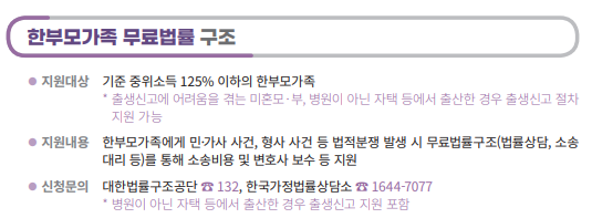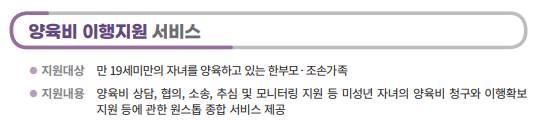 만 19세미만의 자녀를 양육하고 있는 한부모·조손가족에게 양육비 상담, 협의, 소송등의 서비스 제공