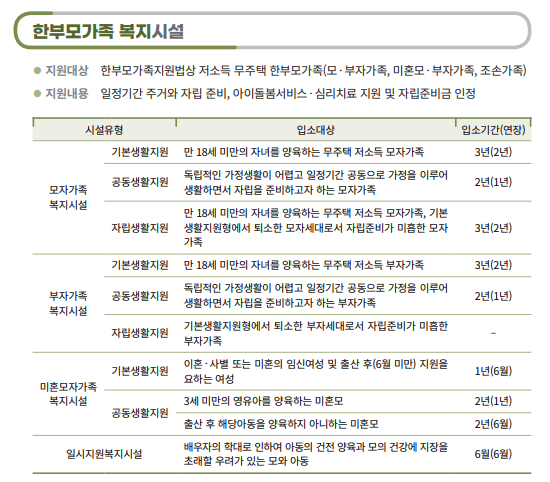 한부모가족지원법상 저소득 무주택 한부모가족(모·부자가족, 미혼모·부자가족, 조손가족)으로 일정기간 주거와 자립 준비, 아이돌봄서비스·심리치료 지원 및 자립준비금 인정
