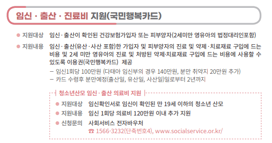 임신·출산(유산·사산 포함)한 가입자 및 피부양자의 진료 및 약제·치료재료 구입에 드는 비용 및 2세 미만 영유아의 진료 및 처방된 약제·치료재료 구입에 드는 비용에 사용할 수 있도록 이용권(국민행복카드) 제공