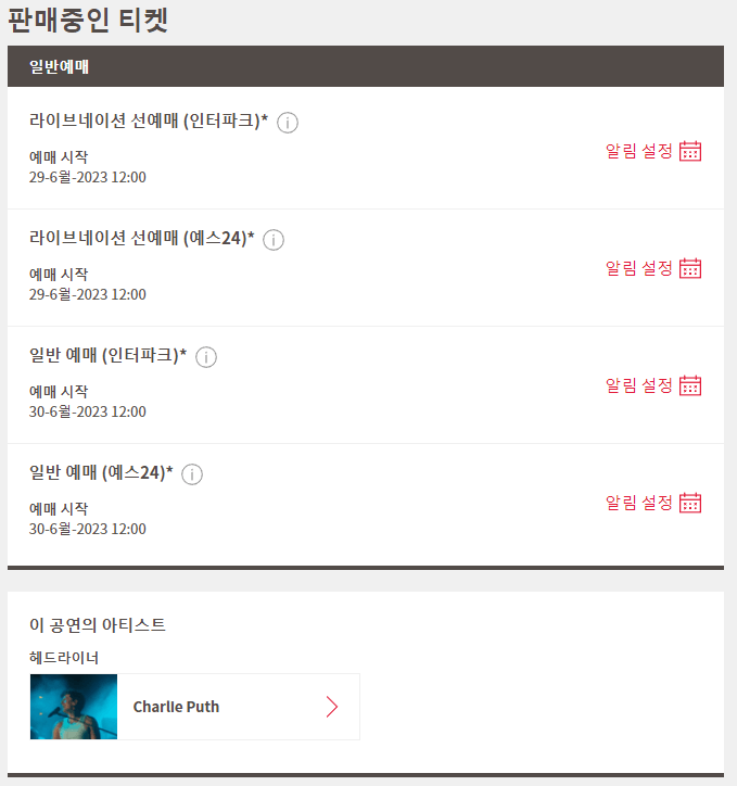 이후 예매 시간이 되면 찰리푸스 티켓팅을 하시면 됩니다.