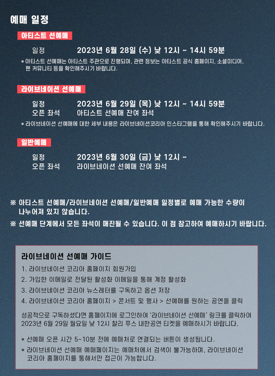선예매 오픈시간 5~10분 전 홈페이지에 로그인한 후에 라이브네이션 선예매 링크를 클릭해야 합니다.