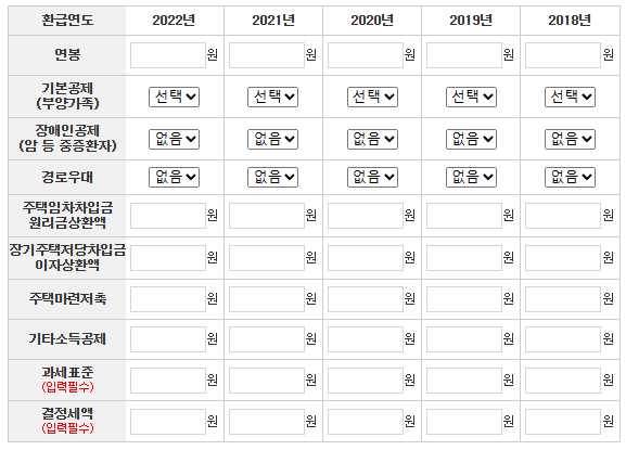 ✔ 근로소득원천징수영수증이 필요하며 각 연도별로 놓친 공제 인원 수를 선택하고 그 외 공제의 경우 지출금액이 아닌 공제금액을 입력하여 근로소득원천징수영수증 2페이지 48번 종합소득 과제표준과 71번 결정세액을 입력한 후 계산하시면 됩니다.