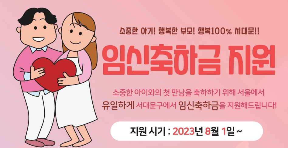 소중한 아이와의 첫 만남을 위해 서울에서 유일하게 서대문구에서 임신축하금을 지원한다고 합니다. 지원시기는 2023년 8월 1일부터 시행된다고 하니 서류를 미리 준비하시어 해당 기간에 신청하시기 바랍니다.
